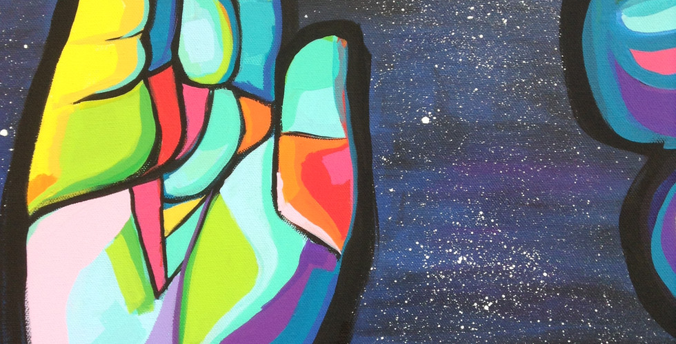 This Jerry Garcia painting features Jerry smiling and waving with his missing digit. A galaxy painted background for this painting titled, "Space Jam."